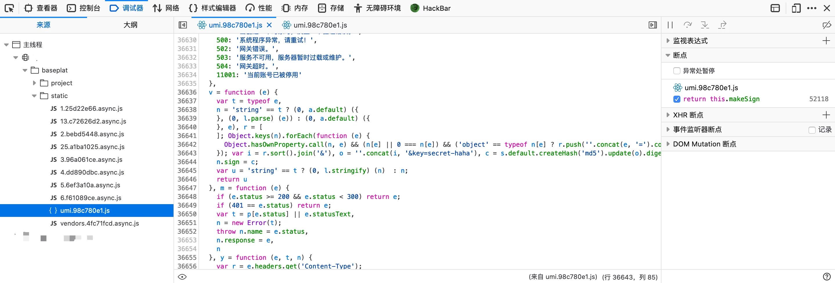 首先我们需要知道既然我们数据包传输过程中sign已经存在那么说明sign的生成肯定是前端的js的功劳了!所以我们需要找到对应的js文件(有时候这是一个漫长的过程)